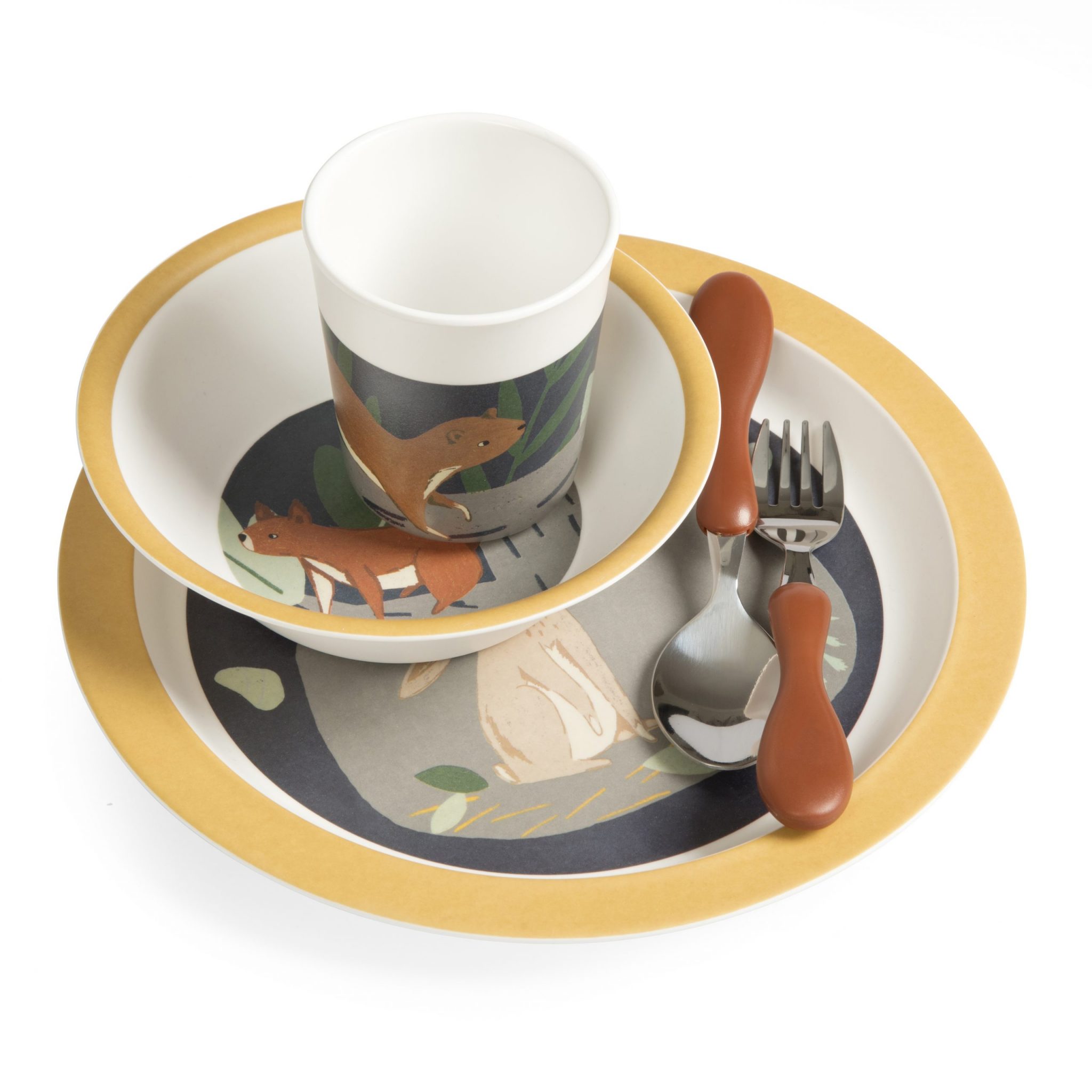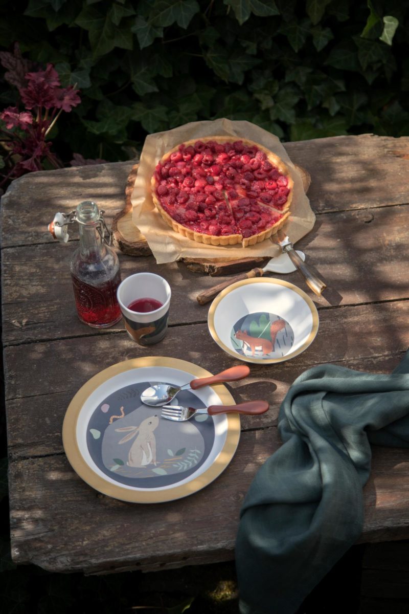 Auf dem flachen Teller ist eine Illustration des Hasen Moonlight in seinem Bau unter dem Waldboden zu sehen und auf dem tiefen Teller kann das Kind das Eichhörnchen Star entdecken, das sich im Dunkel der Nacht seinen Weg durch die Baumkronen bahnt. Auf der Tasse läuft der Bär Woody mitten in der Nacht durch den Wald. Dieses Besteck ist so konzipiert, dass es sich für die kleinen Münder und Hände eignet. Das Besteck liegt gut in der Hand des Kindes, wodurch dem Kind das Erlernen der Technik erleichtert wird. Besteht aus Edelstahl mit Griffen aus Kunststoff.
