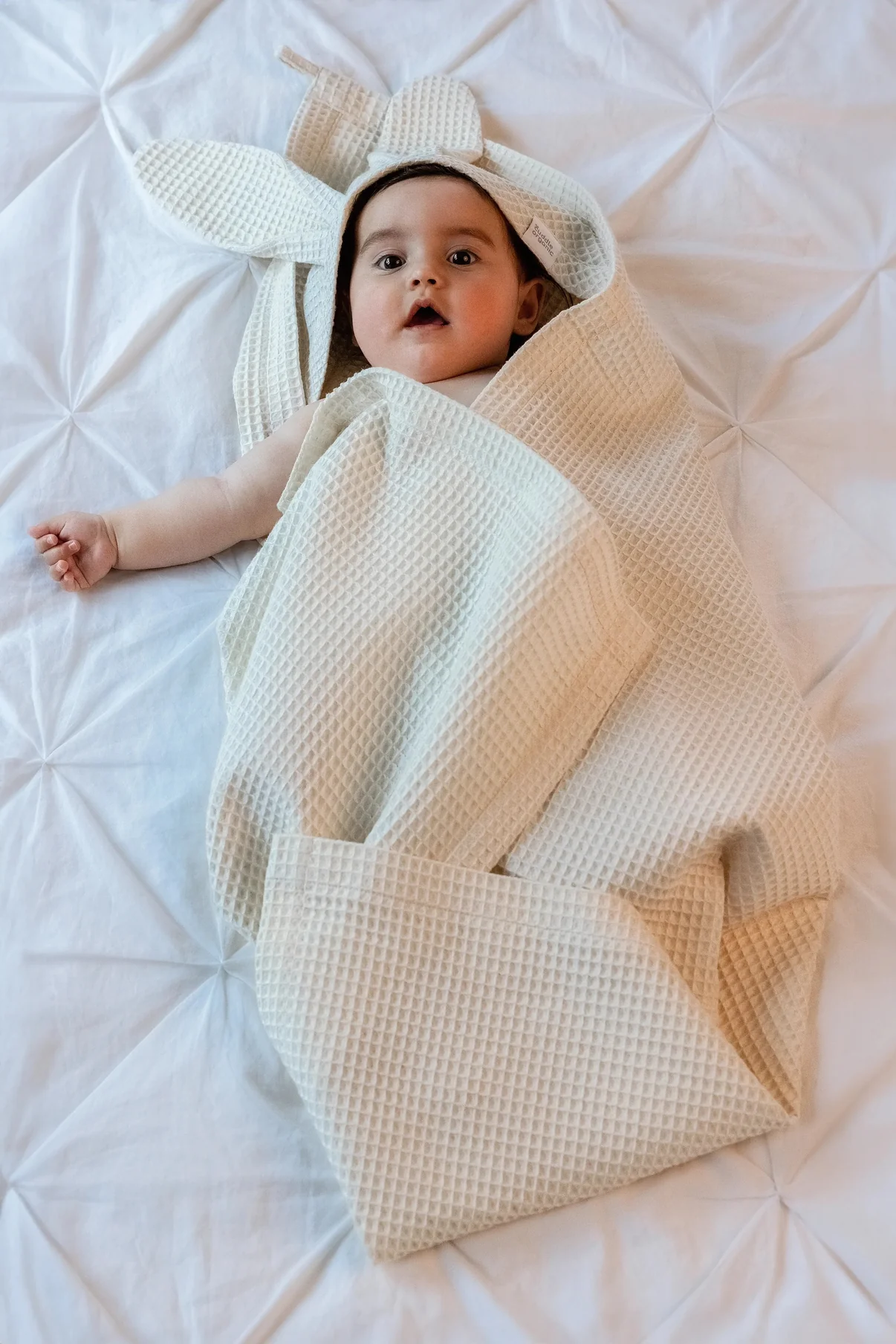 Dieses großzügig bemessene Handtuch wurde mit Sorgfalt aus 100% Bio-Baumwolle mit Waffelmuster gefertigt und eignet sich perfekt für nach dem Baden oder Schwimmen. Der Stoff ist leicht, saugfähig und trocknet schnell und behält diese Eigenschaften auch nach häufigem Waschen. Das Handtuch lässt sich klein verpacken und ist somit ideal für unterwegs. Die Kapuze hält kleine Köpfe warm und die süßen Hasenohren verleihen den alltäglichen Momenten mit Ihrem Baby eine süße Note.