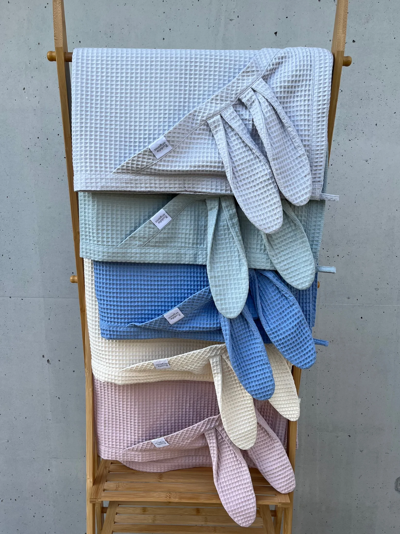 Unsere OEKO-Tex-zertifizierte Bio-Baumwolle ist frei von Schadstoffen und somit eine natürliche und sichere Wahl für die empfindliche Haut Ihres Kindes. Der Stoff ist speziell mit einer 3D-Waffelstruktur versehen, die maximale Saugfähigkeit und ein superweiches Gefühl auf der Haut gewährleistet. Darüber hinaus trocknet das Waffelmaterial schnell und lässt sich klein zusammenfalten, was es praktisch für unterwegs macht.