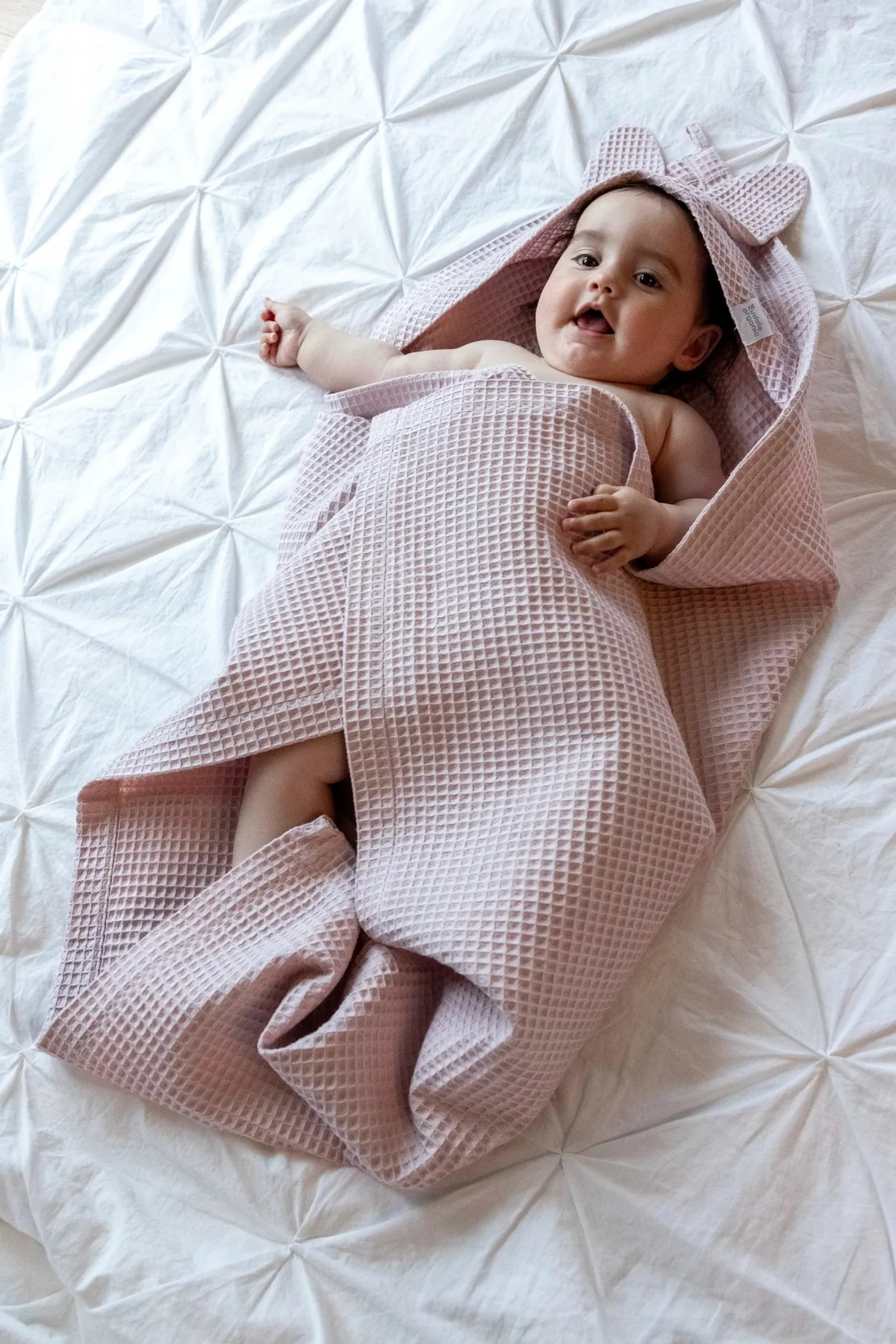 Dieses großzügig bemessene Handtuch wurde mit Sorgfalt aus 100% Bio-Baumwolle mit Waffelmuster gefertigt und eignet sich perfekt für nach dem Baden oder Schwimmen. Der Stoff ist leicht, saugfähig und trocknet schnell und behält diese Eigenschaften auch nach häufigem Waschen. Das Handtuch lässt sich klein verpacken und ist somit ideal für unterwegs. Die Kapuze hält kleine Köpfe warm und die süßen Hasenohren verleihen den alltäglichen Momenten mit Ihrem Baby eine süße Note.